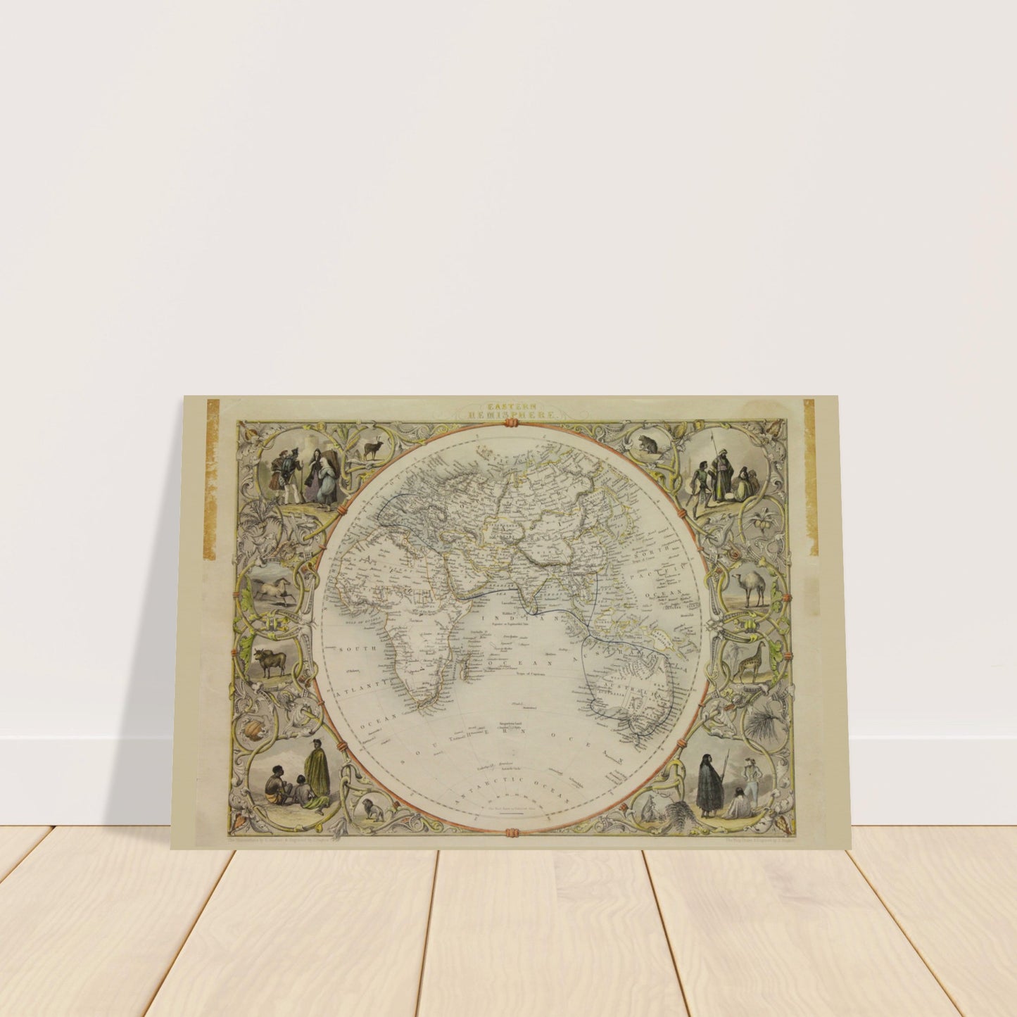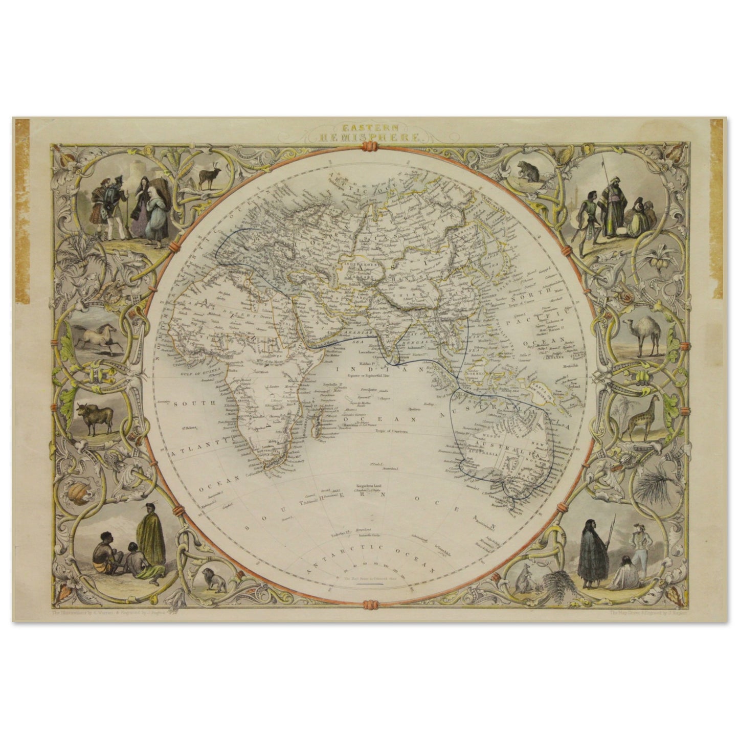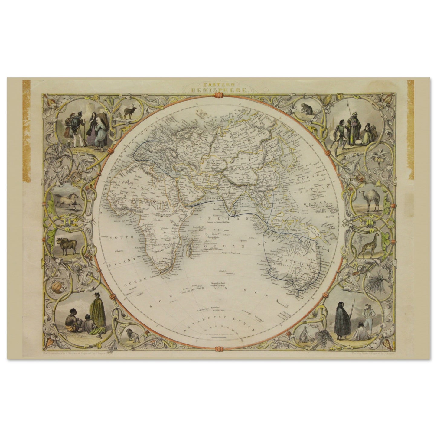 This is a reproduction of a rare John Tallis print called Map, Tallis John, Eastern Hemisphere from c1851. John Tallis and Company published views, maps and Atlases in London from roughly 1838 to 1851.