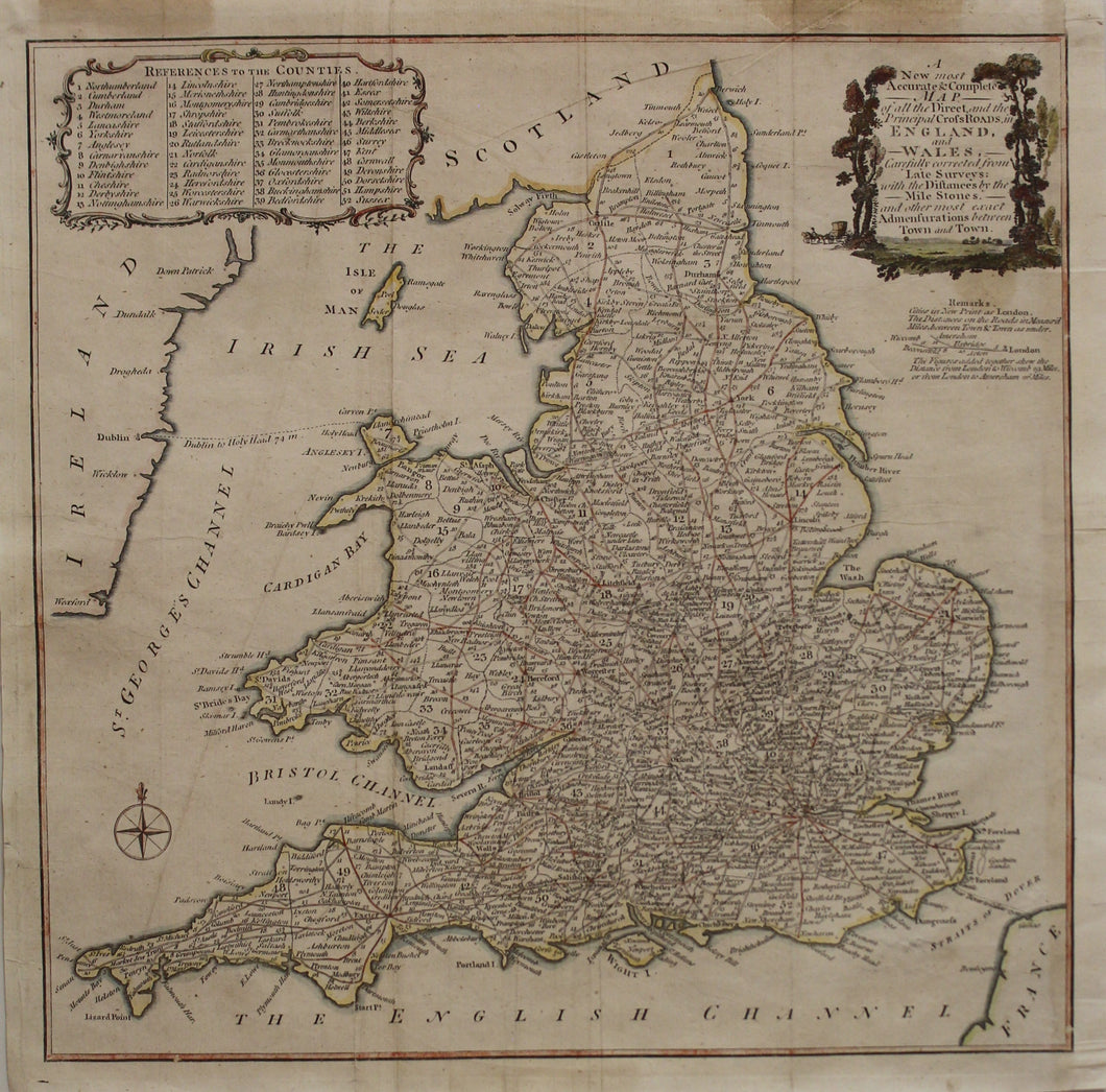 A new most accurate and complete map of all direct and the principal crossroads in England and Wales carefully corrected from late surveys: with the distances by the mile stones and other most exact admensurations between town and town.