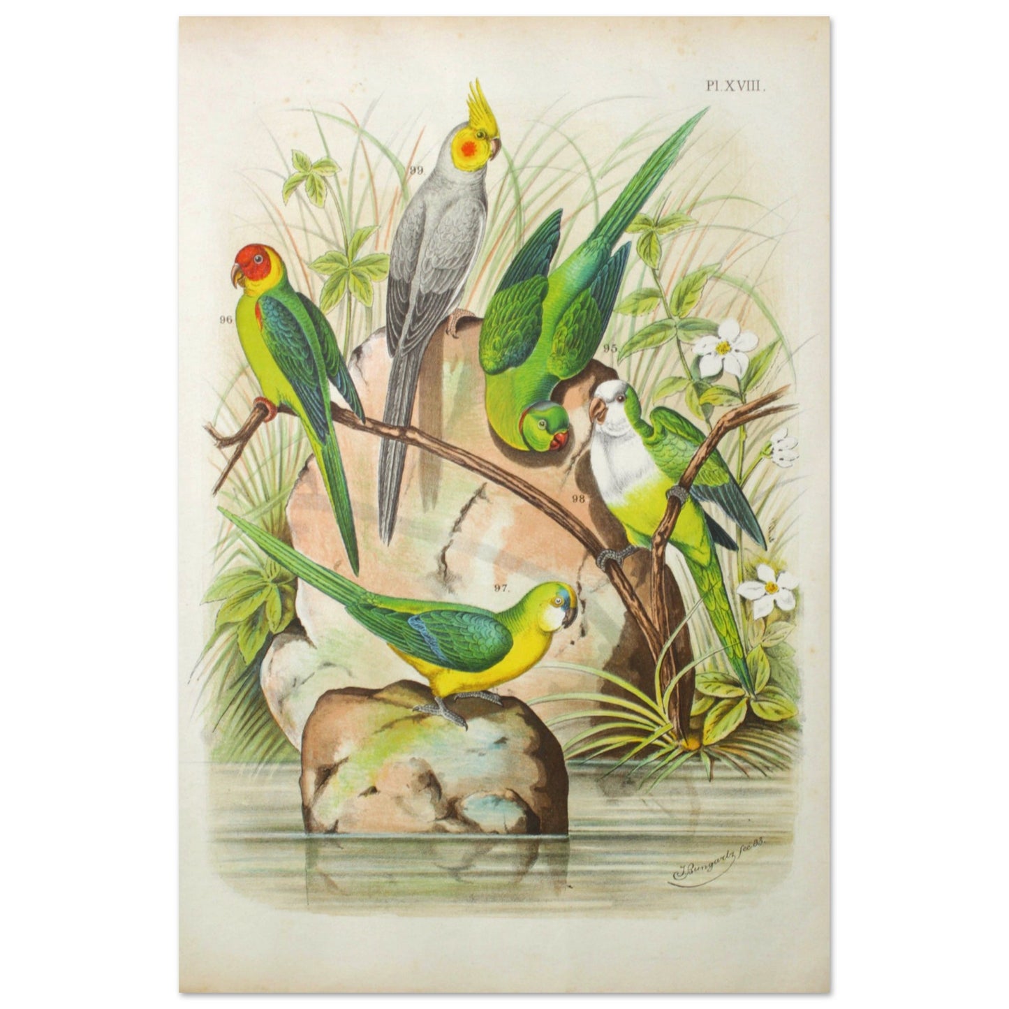 This is a reproduction of A. Nuyens Various Parrots Series Plate XIX of Parrots from 1883.
